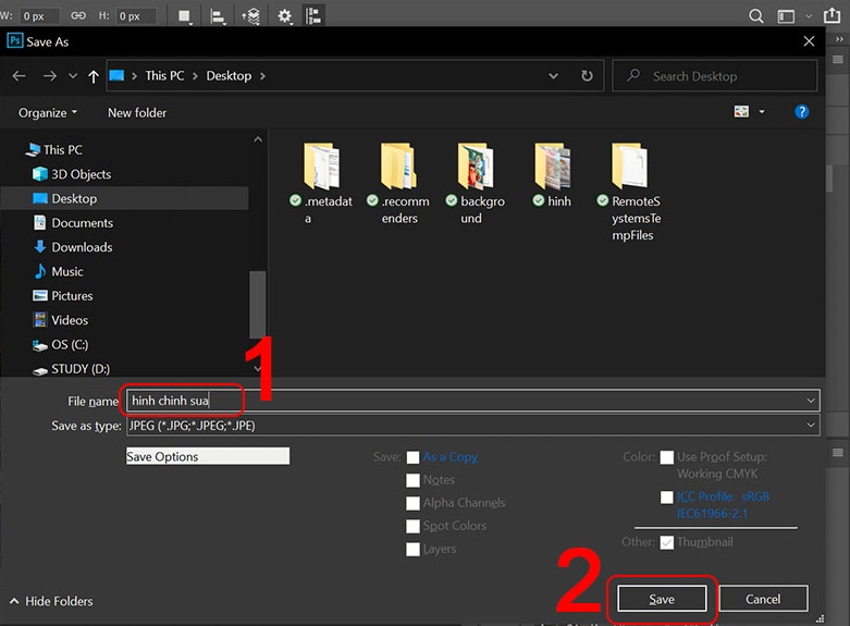 Bước 5: Để lưu ảnh bạn nhấn tổ hợp phím Ctrl + Shift + S > chọn vị trí muốn lưu và thay đổi tên lưu ảnh > chọn định dạng file (JPF, JPEG,…) > nhấn Save để lưu lại.