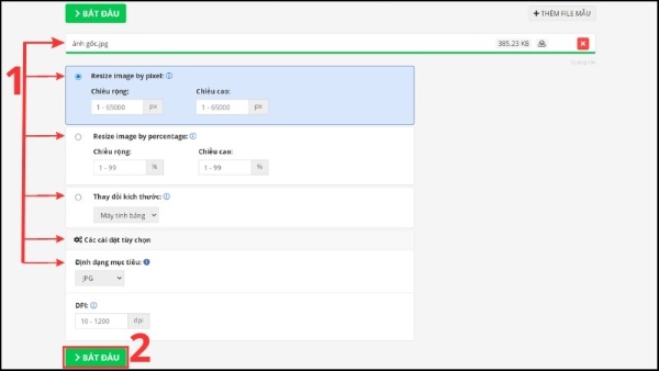 Bước 3: Sau khi hình ảnh được tải lên trang web, bạn chọn kích thước hình ảnh muốn điều chỉnh theo 1 trong 3 tuỳ chọn bao gồm: Phần trăm, Pixel hoặc Tự động theo thiết bị lưu. Sau đó bạn kéo xuống dưới tới mục Định dạng mục tiêu là file ảnh JPG, PNG… để lựa chọn định dạng ảnh phù hợp với nhu cầu của mình > nhấn Bắt đầu.