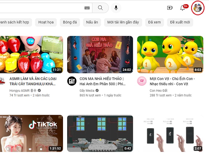 Bước 1: Truy cập vào đường link: https://www.youtube.com/ -> chọn biểu tượng avatar góc phải trên cùng của màn hình.