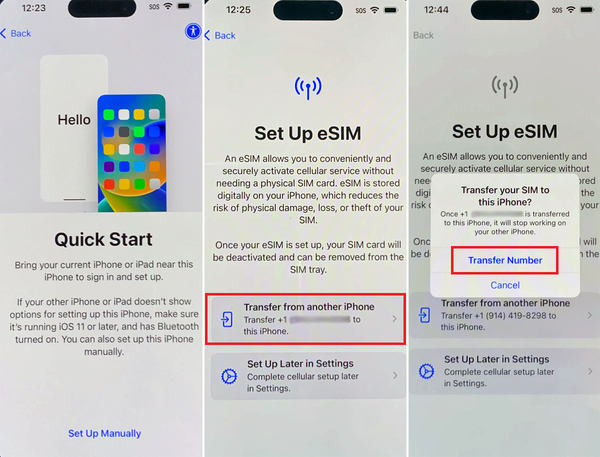 Có một tùy chọn tên là eSIM Quick Transfer cho phép bạn chuyển SIM từ iPhone trước sang SIM mới mà không cần phải liên hệ với nhà cung cấp dịch vụ. Để sử dụng phương pháp này, bạn có thể bấm vào tùy chọn Bắt đầu nhanh trong quá trình thiết lập ban đầu của điện thoại. Điều này sẽ cho phép bạn chuyển dữ liệu và cài đặt từ iPhone cũ sang iPhone mới.