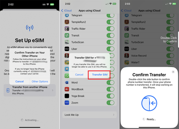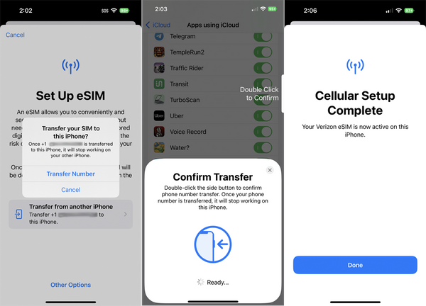 Một thông báo xuất hiện trên iPhone cũ của bạn hỏi có muốn chuyển SIM cho số điện thoại của mình không. Bạn hãy nhấn vào Chuyển SIM và nhấn đúp vào nút bên trên iPhone cũ để xác nhận chuyển. Sau đó, eSIM sẽ kích hoạt trên iPhone mới của bạn và kết nối với mạng di động của nhà cung cấp dịch vụ. Khi quá trình kết thúc, hãy nhấn vào Xong.