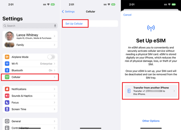 Nếu bạn không chọn tùy chọn chuyển eSIM trong quá trình thiết lập ban đầu, thì có thể thực hiện sau đó. Điện thoại iPhone của bạn có thể sẽ nhắc bạn thiết lập quyền truy cập di động, tuy nhiên bạn cũng có thể đi tới mục Cài đặt > Chọn Di động và nhấn Thiết lập Di động. Sau đó chạm vào Chuyển từ iPhone khác > Chọn Số chuyển để xác nhận lựa chọn của bạn.