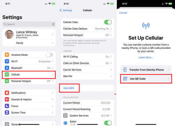 Sau khi thêm nhà cung cấp dịch vụ chính, hãy mở Cài đặt > Chọn mạng di động để thêm các nhà cung cấp dịch vụ hoặc gói cước khác vào iPhone 14 của mình. Nhấn vào Thêm eSIM và nhấn vào Sử dụng mã QR (nếu bạn có mã QR cho nhà cung cấp) và quét mã của mã đó.
