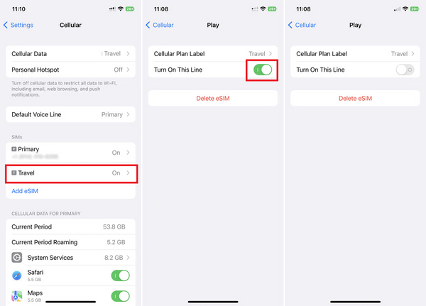 Néu không cần dùng eSIM phụ nữa thì bạn có thể tắt eSIM đó đi bằng cách chọn nó và tắt công tắc bên cạnh Bật Dòng này.