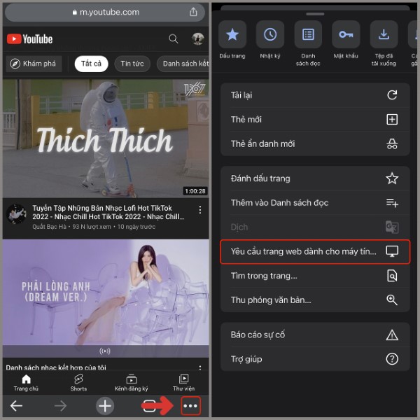 Bước 2: Nhấn vào biểu tượng ba chấm ở góc dưới bên phải, sau đó chọn Yêu cầu trang web dành cho máy tính.