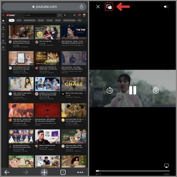 Bước 3: Tìm video bạn muốn phát, sau đó nhấn vào biểu tượng Picture in Picture như hình minh họa.