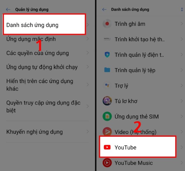 Bước 2: Tiếp tục truy cập Danh sách ứng dụng và chọn YouTube.