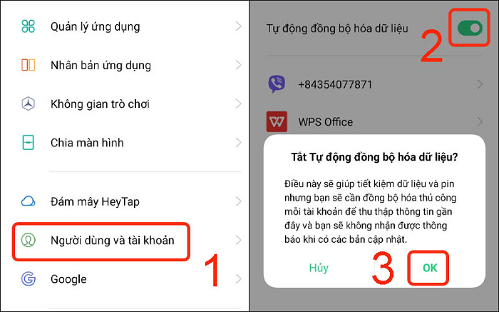 Việc tự động bộ hoá dữ liệu có thể làm cho điện thoại của bạn bị hao tốn một lượng pin lớn. Bạn nên kiểm tra xem tính năng tự động bộ hoá dữ liệu đã tắt hay chưa. Nếu chưa thì hãy tắt nó bằng cách truy cập vào mục Cài đặt > Chọn mục Người dùng và tài khoản > Tắt tự động đồng bộ hóa dữ liệu bằng cách gạt thanh ngang sang trái > Nhấn OK.