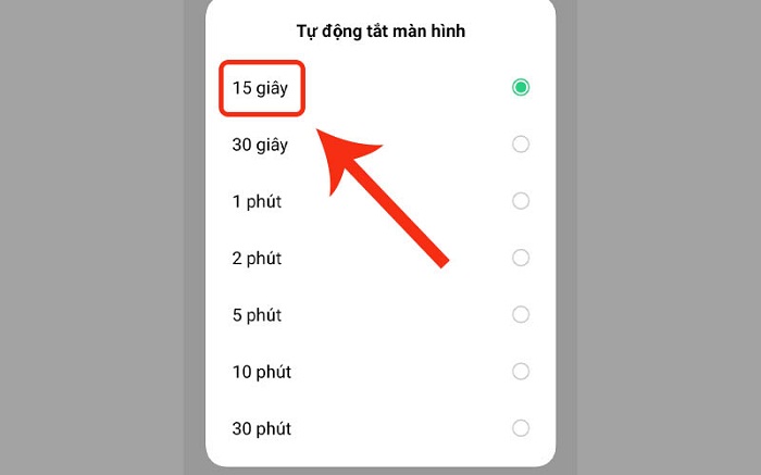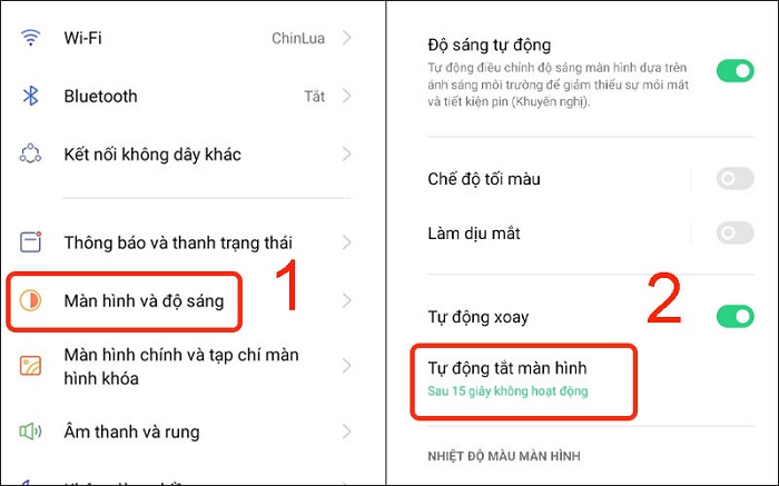 Do đó, bạn hãy giảm thời gian chờ của màn hình đi để tiết kiệm pin hơn bằng cách truy cập vào mục Cài đặt > Chọn mục Màn hình và độ sáng > Chọn mục Tự động tắt màn hình > Tích vào thời gian mong muốn là được.
