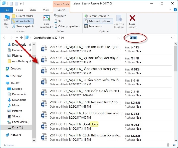 Thông thường, để tìm kiếm, bạn mở cửa sổ Windows Explorer, chọn vị trí ổ đĩa cần tìm kiếm, và nhập từ khóa vào ô tìm kiếm ở góc trên cùng bên phải. Ví dụ, để tìm file có định dạng .docx.