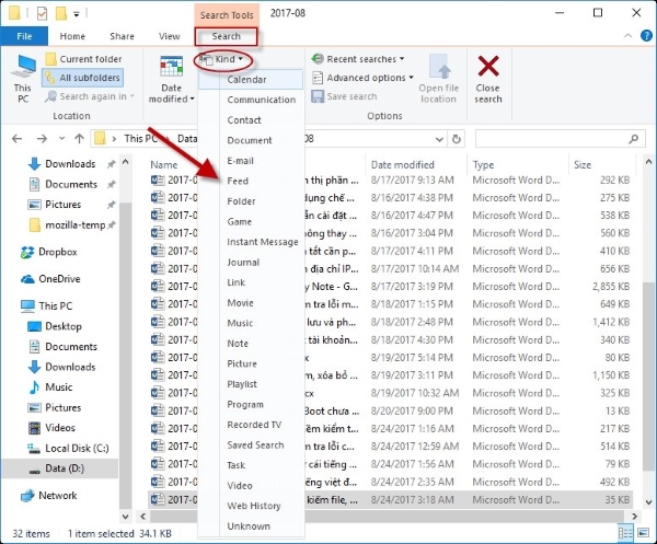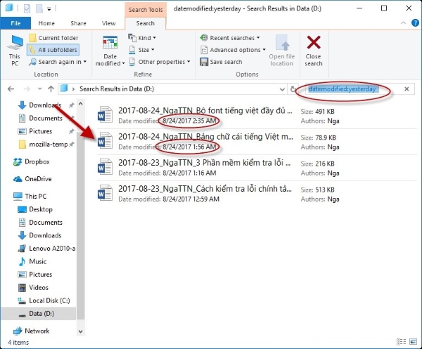 Khi muốn tìm kiếm các file theo ngày giờ tạo, bạn có thể sử dụng tùy chọn “Date Modified”. Bắt đầu bằng cách chọn Search -> Date Modified -> chọn khoảng thời gian mà bạn muốn tìm kiếm file. Ví dụ, cách tìm file đã lưu trong Word để tìm các file dữ liệu được tạo vào ngày hôm qua, bạn chọn tùy chọn “Yesterday”.