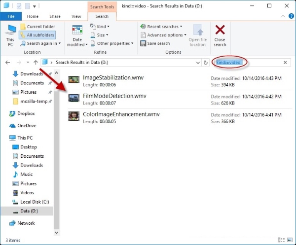 Thực hiện bằng cách chọn Search -> Kind -> chọn loại file cần tìm, ví dụ trong trường hợp này, chọn Video: