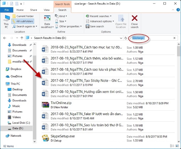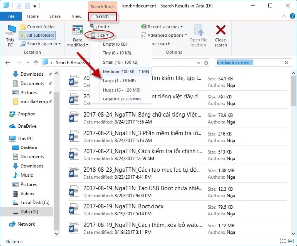 Tìm kiếm file theo dung lượng với từ khóa Size