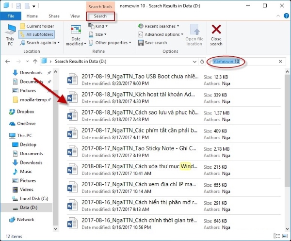 Ví dụ, nếu bạn muốn tìm các file có liên quan đến Windows 10, chọn Name -> nhập từ khóa tìm kiếm là “Win 10”. Kết quả sẽ hiển thị tất cả các file và tập tin có tên chứa từ khóa “Win 10”.