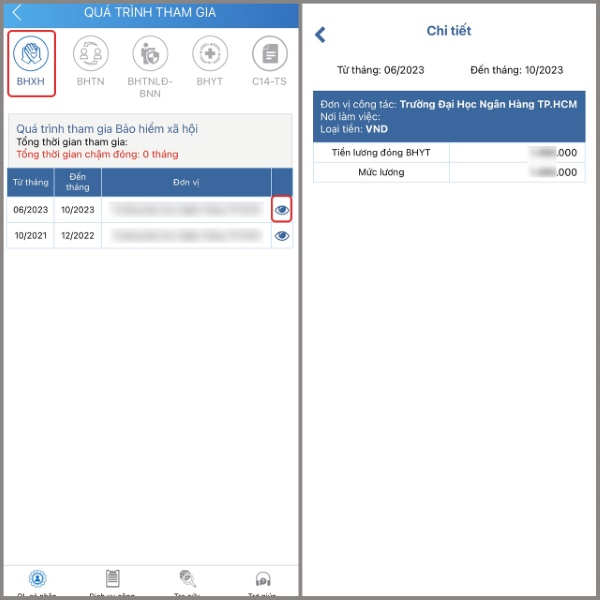 Bước 2: Chọn tiếp vào phần Bảo hiểm xã hội > sau đó nhấn chọn vào biểu tượng con mắt để xem chi tiết thông tin. Tại đây, bạn cần chú ý 2 chi tiết sau: