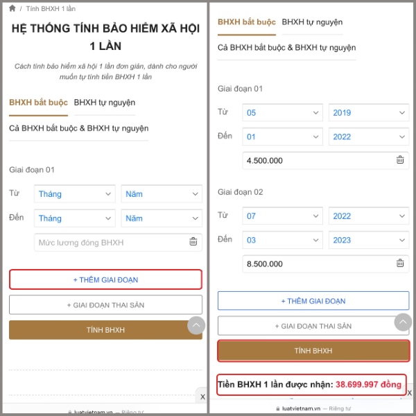 Sau đó, bạn nhập những thông tin về khoảng thời gian và mức tiền lương đã đóng > nhấn chọn Thêm giai đoạn để bổ sung mốc thời gian tương ứng. Sau khi đã nhập xong các dữ liệu theo yêu cầu, bạn nhấn vào Tính BHXH. Lúc này, tổng số tiền bảo hiểm xã hội một lần sẽ được hiển thị tại góc dưới màn hình.