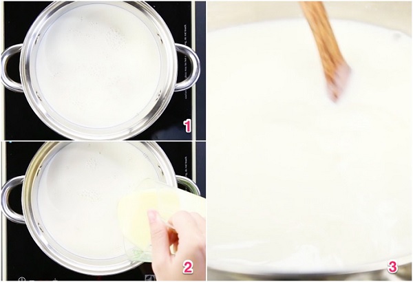 Bạn đặt nồi lên bếp, sau đó cho vào nồi 1 lít sữa tươi không đường, ½ hũ sữa đặc rồi đun ở mức nhiệt lửa nhỏ. Tiếp đến khuấy đều sữa tươi với sữa đặc rồi tiếp tục đun ở lửa nhỏ đến khi sôi lăn tăn thì thôi.