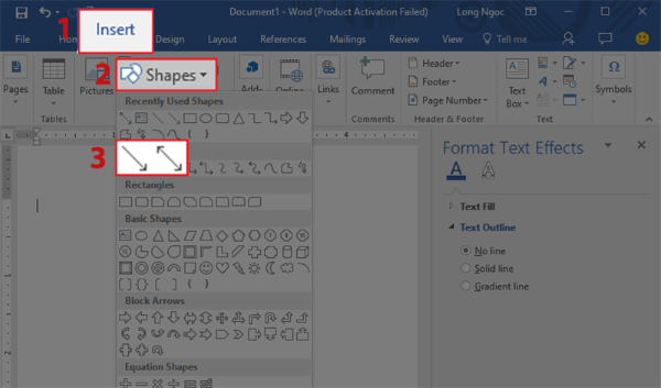 Bước 1: Mở Word trên máy tính, vào Insert > Chọn Shapes > Chọn hình mũi tên thẳng hoặc mũi tên hai chiều mà bạn muốn vẽ.