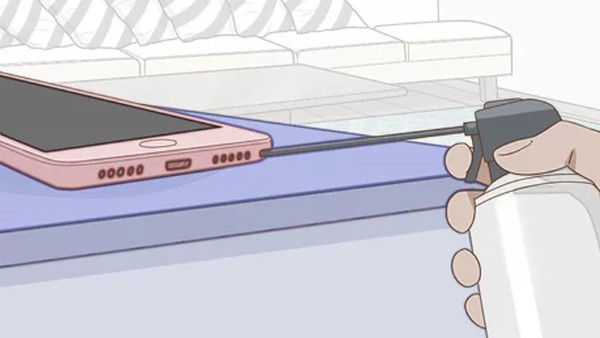 Cách làm sạch màng loa iPhone sử dụng bình khí nén.