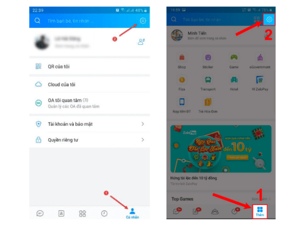 Bước 2: Khởi chạy ứng dụng Zalo đã thực hiện tải xuống > Chọn vào mục biểu tượng Cá nhân hoặc vào mục Thêm ở vị trí góc dưới bên phải của giao diện màn hình > Chọn vào hình biểu tượng Cài đặt ở góc bên phải của giao diện.