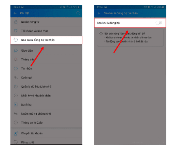 Bước 3: Chọn vào tính năng cho phép Sao lưu & Đồng bộ tin nhắn > Gạt công tắc tại phần Sao lưu & đồng bộ sang phía phải để thực hiện đồng bộ.