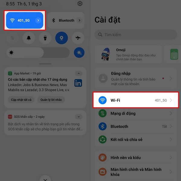 Bước 1: Bạn truy cập vào cài đặt WiFi qua phím tắt trên trung tâm điều khiển. Hoặc có thể vào Cài đặt máy/ WiFi.