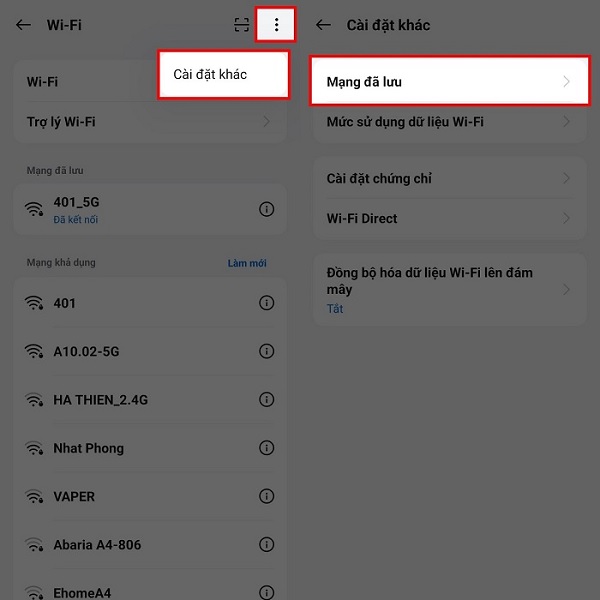 Bước 2: Tại bước này sẽ hiện lên danh sách các Wifi mà bạn có thể kết nối. Bạn nhìn lên góc phải của màn hình thấy biểu tượng menu 3 chấm đứng. Click vào đó và chọn vào Cài đặt khác/ chọn mục Mạng đã lưu để tiến hành xem lại các Wif mà bạn đã kết nối.