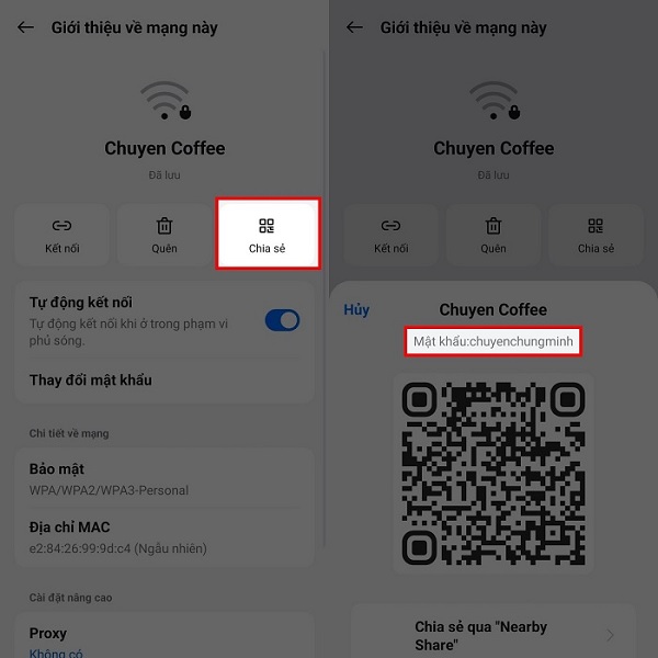 Bước 3: Trong bước 3 của cách xem mật khẩu WiFi trên OPPO. Bạn chọn vào WiFi bạn cần xem mật khẩu. Khi đó mật khẩu sẽ nằm ở phần Chia sẻ. Bạn chỉ việc ấn vào đó, sẽ có một mã QR hiện lên cùng với mật khẩu bên trên đó tương tự như hình bên dưới đây.