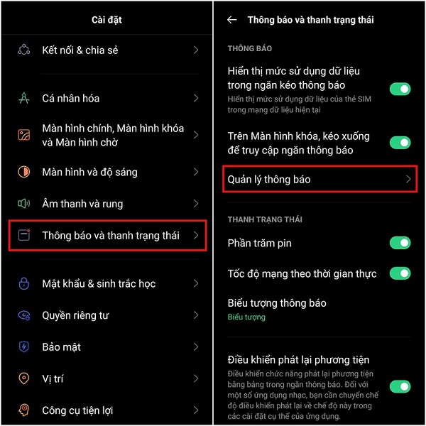 Bước 1: Bạn truy cập vào mục Cài đặt, sau đó nhấn vào mục Thông báo và thanh trạng thái rồi chọn mục Quản lý thông báo.