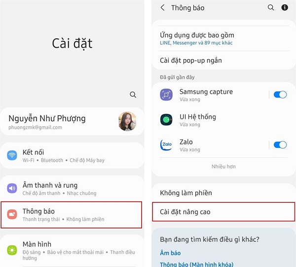 Bước 1: Bạn tiến hành truy cập vào mục cài đặt trên điện thoại, sau đó bạn chọn Thông báo và chọn mục Cài đặt nâng cao.