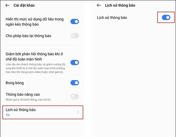 Bước 2: Bạn bấm chọn vào mục Lịch sử thông báo và bật tính năng lên để có thể thực hiện được cách xem tin nhắn đã thu hồi trên Zalo.