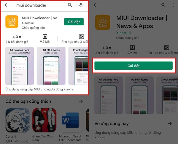 Bước 1: Bạn Truy cập vào ứng dụng CH Play, sau đó tải ứng dụng MIUI Downloader về điện thoại.