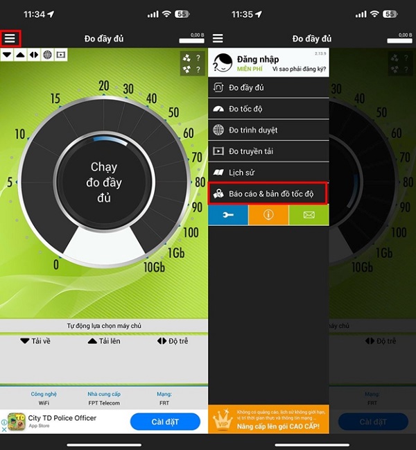 Bước 2: Tại giao diện chính, bạn nhấn vào biểu tượng ba dấu gạch ngang ở góc trên bên trái, chọn mục “Báo cáo và bản đồ tốc độ”.