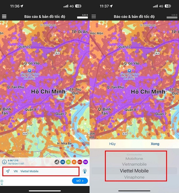 Tại đây, ứng dụng sẽ hiển thị nhà mạng bạn đang sử dụng. Nếu muốn kiểm tra vùng phủ sóng của nhà mạng khác, bạn chọn tên nhà mạng ở menu và thực hiện kiểm tra.
