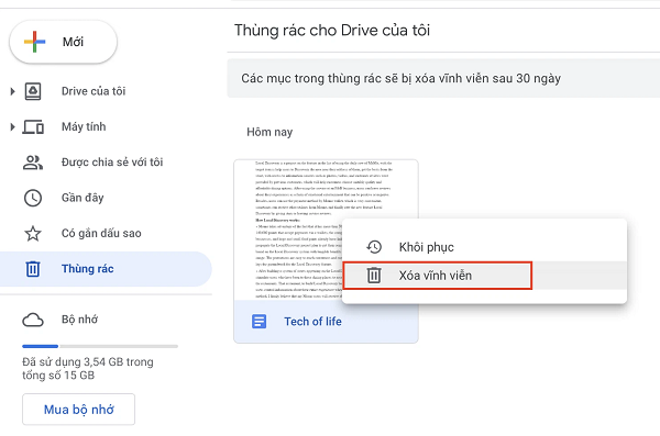 – Sau khi xoá File ở giao diện của Google Drive, lúc này tệp tin vẫn chưa được xoá hoàn toàn, đồng thời dung lượng cũng chưa được giải phóng. Bạn hãy truy cập vào Thùng rác để xóa tiếp 1 lần nữa.