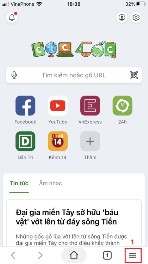B1. Trên Cốc Cốc Mobile, chạm vào biểu tượng Hộp công cụ bên dưới (3 dấu gạch ngang).