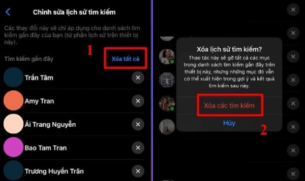 Bước 2: Tiếp đó, chọn vào Xóa tất cả > Một hộp thoại sẽ được hiển thị giúp bạn xác nhận thao tác > Ấn chọn Xóa các tìm kiếm để quá trình thực hiện xóa diễn ra tự động, và hoàn tất một cách nhanh chóng.