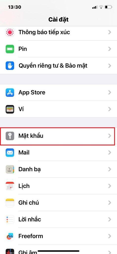 Nếu muốn xóa cùng lúc nhiều mật khẩu đã lưu trên điện thoại iPhone của mình, bạn cũng truy cập vào mục Cài đặt, rồi tìm và nhấn chọn vào mục Mật khẩu.