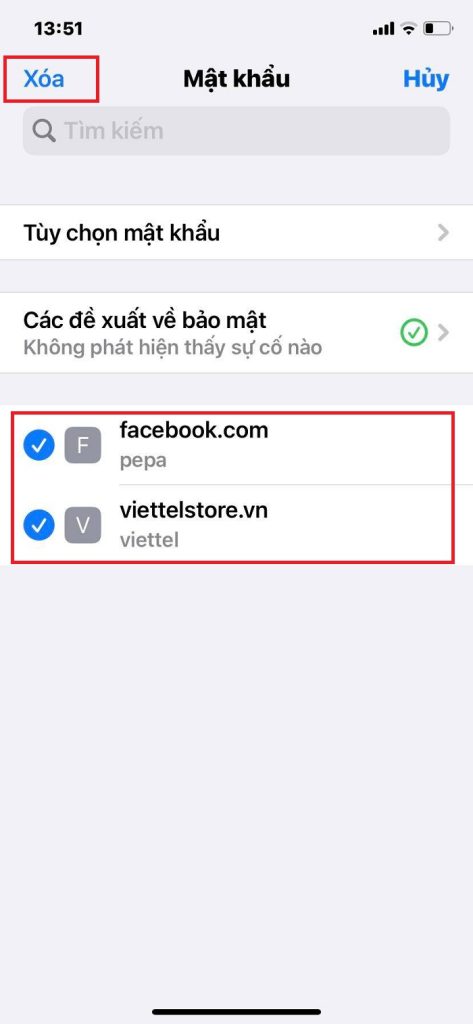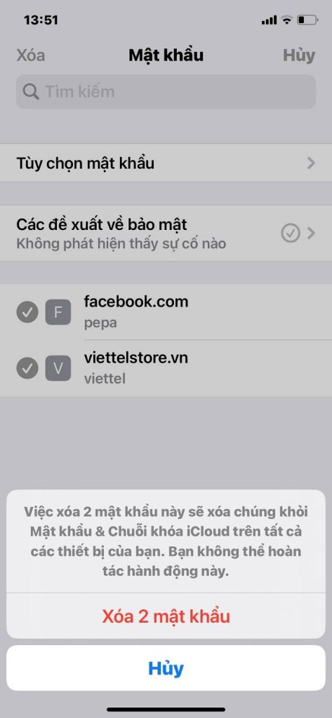Cuối cùng, bạn nhấn vào Xóa ở góc trên bên trái màn hình, rồi tiếp tục chọn Xóa … mật khẩu (… là số lượng mật khẩu đã chọn để xóa) để xác nhận.