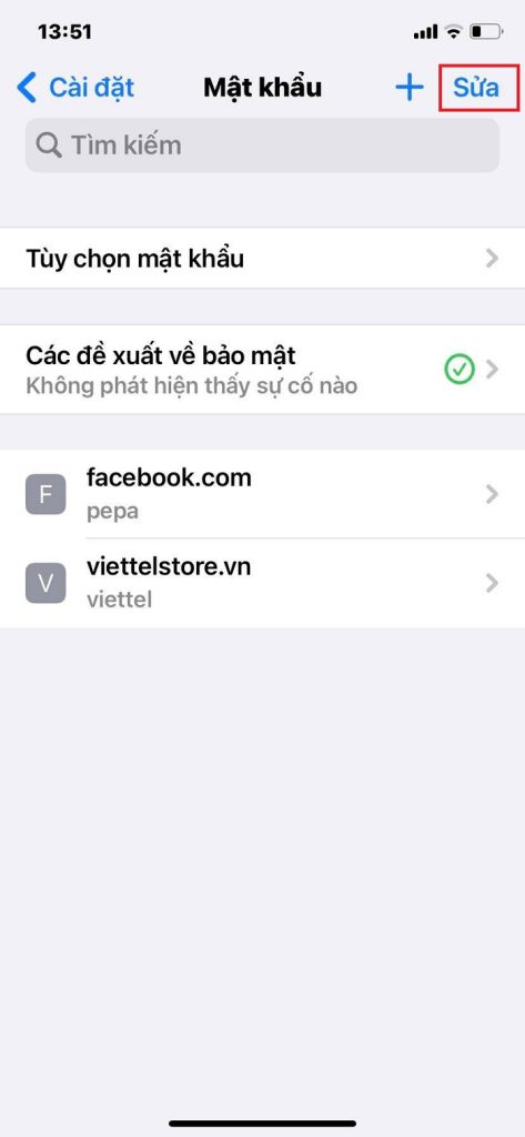 Tiếp theo, bạn nhấn chọn vào mục Sửa ở góc trên bên phải màn hình, rồi chọn các mật khẩu muốn xóa.