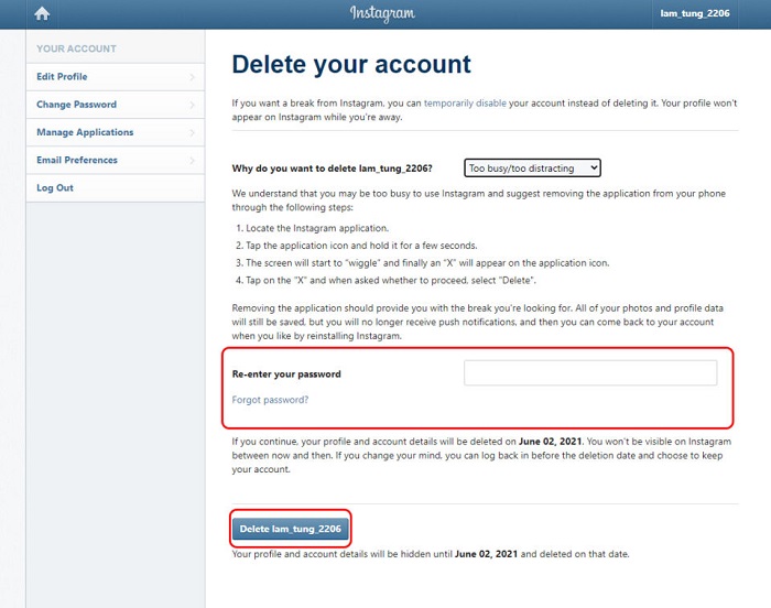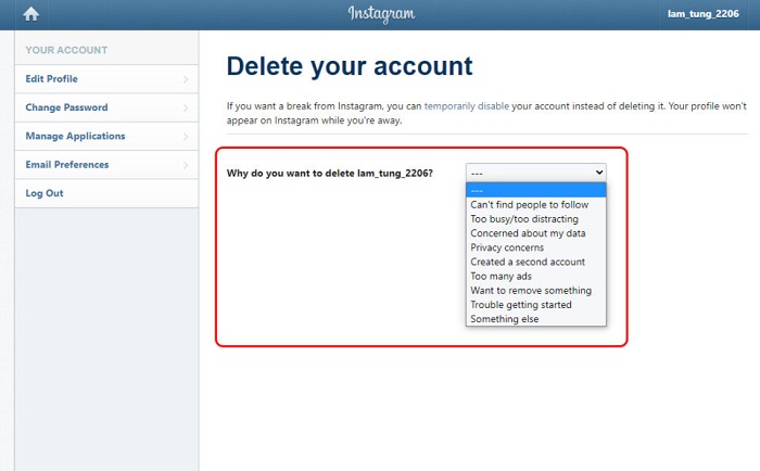 Xóa tài khoản Instagram trên máy tính