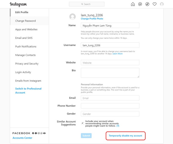 Vô hiệu hóa tài khoản Instagram tạm thời trên máy tính