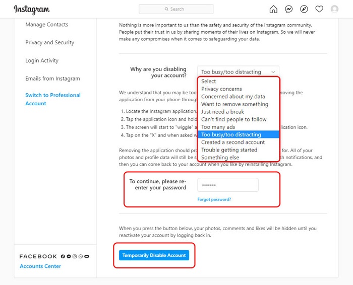 – Bước 4: Tại giao diện chỉnh sửa thông tin cá nhân bạn kéo xuống phía dưới và chọn vào mục “Temporarily disable my account”. Và sau đó tiếp tục chọn lý do vô hiệu hóa tài khoản. Tiếp theo nhập mật khẩu và chọn “Temporarily Disable Account”.