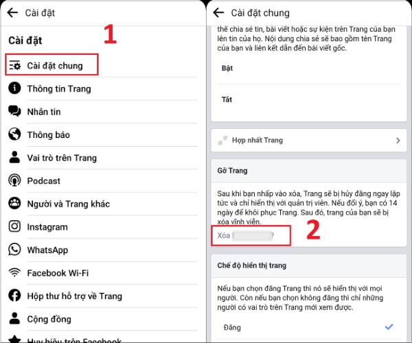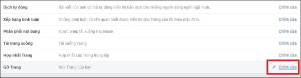 Bước 3: Chuyển sang giao diện mới, chọn mục Cài đặt chung, kéo xuống phía dưới và nhấn vào Xóa [Tên fanpage của bạn] tại phần Gỡ Trang.