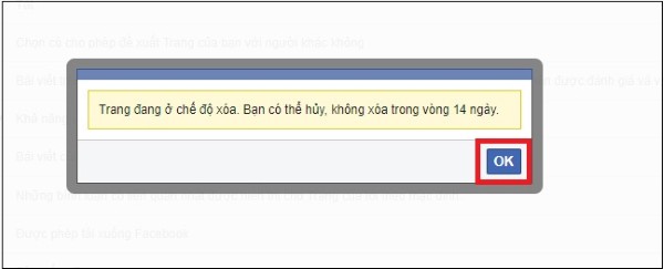 Lưu ý: Sau khi thực hiện thao tác xóa, bạn có thể khôi phục lại fanpage trong vòng 14 ngày nếu thay đổi quyết định. Trong trường hợp không hủy yêu cầu, sau thời gian này trang sẽ bị xóa vĩnh viễn.