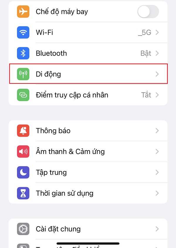 Bước 2: Trong phần cài đặt, bạn tìm và chọn mục Di động. Đây là nơi bạn có thể điều chỉnh các tùy chọn liên quan đến kết nối mạng di động của mình.