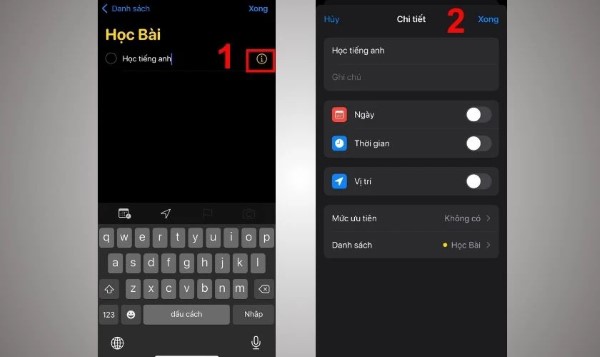 Bước 5: Nhấn vào biểu tượng (i) để chỉnh sửa các chi tiết như thời gian, địa điểm hoặc mức độ ưu tiên. Cuối cùng, nhấn Xong để lưu lại. Vậy là bạn đã hoàn tất việc thiết lập lời nhắc trên iPhone bằng Reminders.
