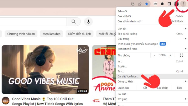 Bước 1: Mở trình duyệt Chrome, nhập địa chỉ “youtube.com” vào thanh tìm kiếm. Tiếp theo, nhấn vào biểu tượng “ba chấm” ở góc trên bên phải và chọn “Cài đặt YouTube” từ danh sách tùy chọn.