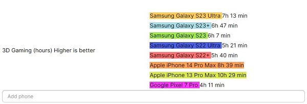 Cùng bài kiểm tra đó, Galaxy S23 Plus đạt được 6 giờ 47 phút và Galaxy S23 Ultra có được 7 giờ 13 phút. Thực hiện chơi game 3D là tác vụ được xem là nặng nhất trong các tác vụ hàng ngày mà người dùng thường xuyên thực hiện, những con số mà Galaxy S23 có được là rất ấn tượng.