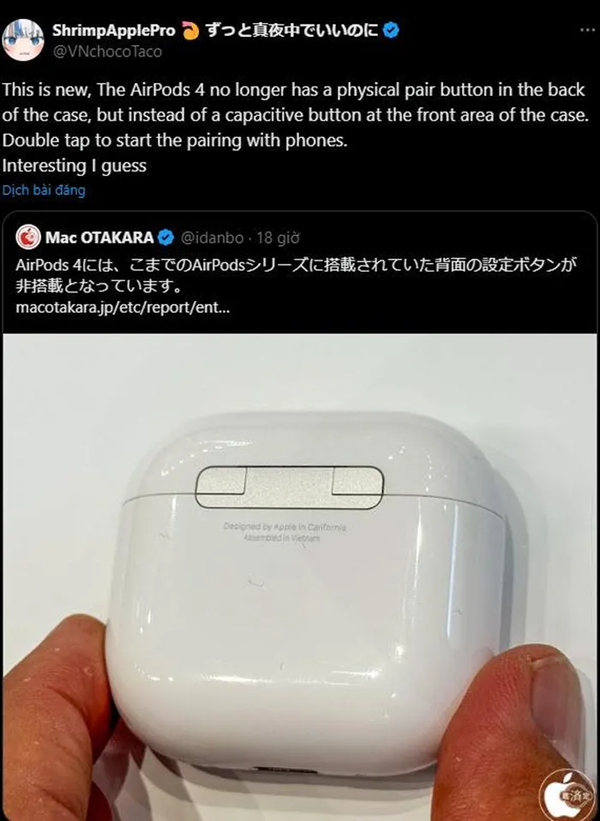 Trước đó, nút ghép nối vật lý truyền thống được Apple bố trí ở phần mặt sau của hộp đựng, giúp việc ghép nối và khôi phục cài đặt gốc nhanh chóng, dễ dàng hơn. Tuy vậy, phiên bản mới năm nay đã loại bỏ nút này và thay bằng nút điện dung ẩn, được bố trí ở phần mặt trước của hộp đựng, ngay bên dưới vị trí của đèn trạng thái. Việc cải tiến nút điện dung trên AirPods 4 sẽ giúp bạn thực hiện việc ghép nối cũng như khôi phục cài đặt gốc cho thiết bị chỉ bằng cách mở hộp đựng và chạm đúp vào nút điện dung một cách đơn giản, thuận tiện và trực quan hơn.